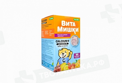 ВитаМишки Кальций Плюс - сбалансированный витаминно-минеральный комплекс в виде вкусных мармеладных пастилок мишек с натуральными фруктовыми и овощными экстрактами, снабжают детский организм кальцием, фосфором и витамином D, способствует укреплению костей и зубов, снижает риска возникновения кариеса.