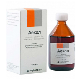 В 100 мл раствора Аекол содержится по 180 мг альфатокоферола ацетата и бетакаротена, менадион – 50 мл и ретинол + вспомогательные вещества (подсолнечное масло).