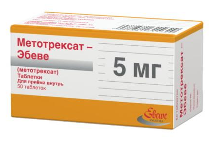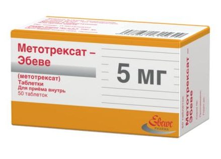 Цена Метотрексат-эбеве в аптеках: от 322 рублей до 450 рублей (5 мг / 50 таблеток )