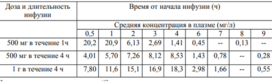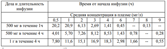 Концентрации дорипенема в плазме: средние концентрации в плазме (мг/л) дорипенема после одной 1-часовой и 4-часовой внутривенной инфузии 500 мг и одной 4-часовой инфузии 1 г показаны ниже в таблице.