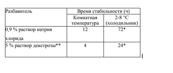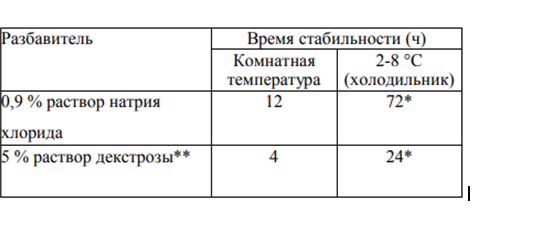 * После извлечения из холодильника инфузионный раствор должен быть введен пациенту в течение разрешенного времени хранения при комнатной температуре. При этом суммарное время хранения раствора в холодильнике, время согревания раствора до комнатной температуры и время введения раствора пациенту не должно превышать в общей сложности допустимого времени хранения в холодильнике. ** 5 % раствор декстрозы не должен использоваться для введения инфузий длительностью более 1 ч.